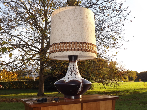 1980er Jahre. Fuß mit lavaartigem Glasurverlauf; funktionsfähige Elektrik; original erhaltener, textilbespannter, zylindrischer Lampenschirm. Klassisches Design westdeutscher Kunstkeramik der zweiten Hälfte des 20. Jh. Alterskonformer Erhaltungszustand, auch mit zeitgemäßen LED Leuchtmitteln nutzbar.