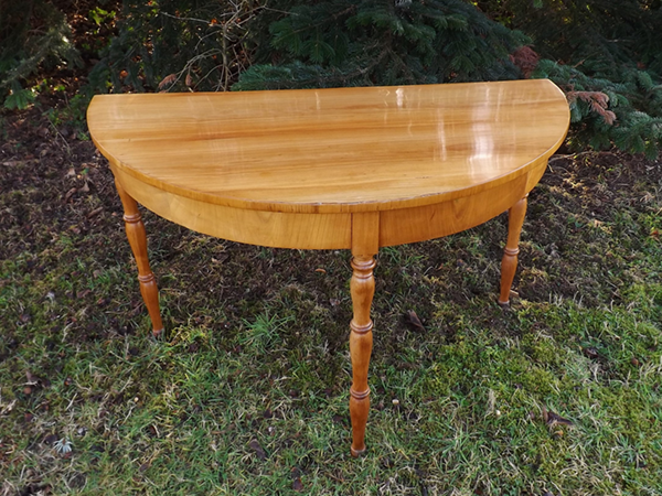 Halbrunder Konsoltisch Schellack poliert. Schmale, aufrecht furnierte Zarge auf gedrehten Beinen, längs furnierte Tischplatte. Rückseitig eine kleine, versteckte Schublade. Bürgerliches Wohnzimmermöbel aus Bonn zweite Hälfte 19. Jahrhundert. Ältere, aufgefrischte Restaurierung.