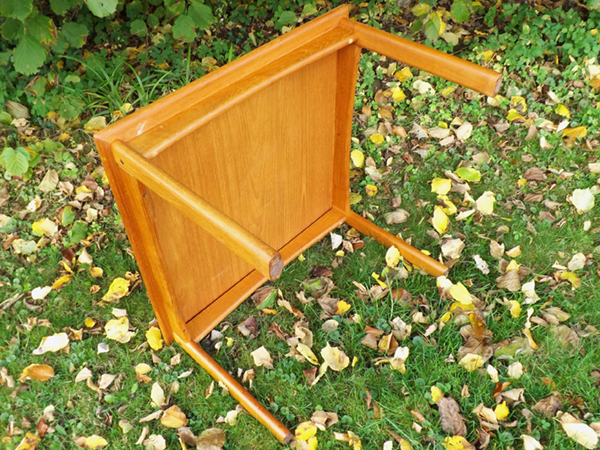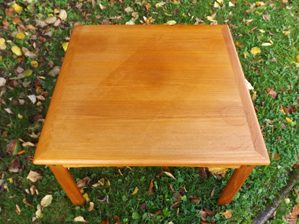 Dänisches Design, 1980er Jahre. Kleiner, quadratischer Beistelltisch, gut erhalten. Gestell aus massivem Teakholz; Innenfläche der Platte beidseitig furniert. Alterskonformer Fundzustand, Patina- und Gebrauchsspuren.
