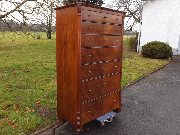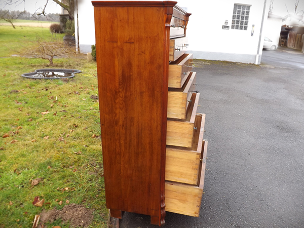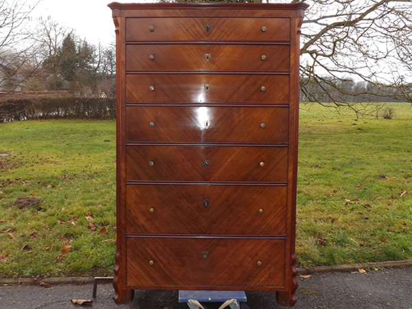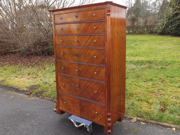 Mahagoni furniert, um 1890. Hochrechteckiger, siebenschübiger Korpus mit geschrägten, Voluten verzierten Lisenen; flächige Seitenwände. Funktionsfähige Schlösser mit Schlüsseln; sekundäre Beschläge aus Messing. Bürgerliche Hochkommode des westlichen Rheinlandes, spätes 19. Jahrhundert. Ältere, aufgefrischte Restaurierung.