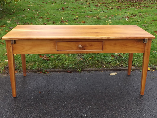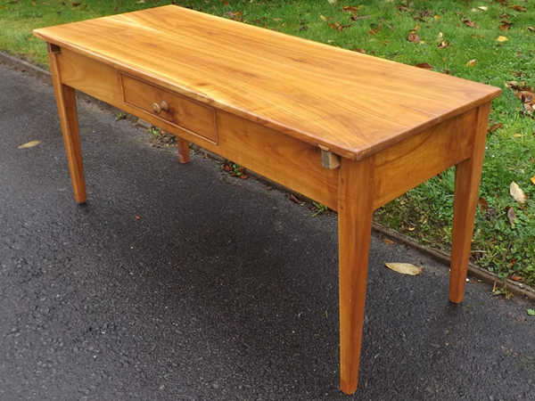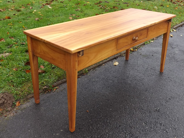 Kirschbaum massiv; um 1860. Ländlicher Biedermeiertisch, aus der südlichen Eifel. Einschübiger Zargenkasten auf konischen Spitzbeinen; sekundäre, rechteckige, abnehmbare Platte. Ältere Restaurierung, alterskonformer guter Erhaltungszustand.