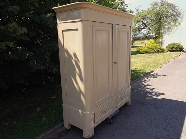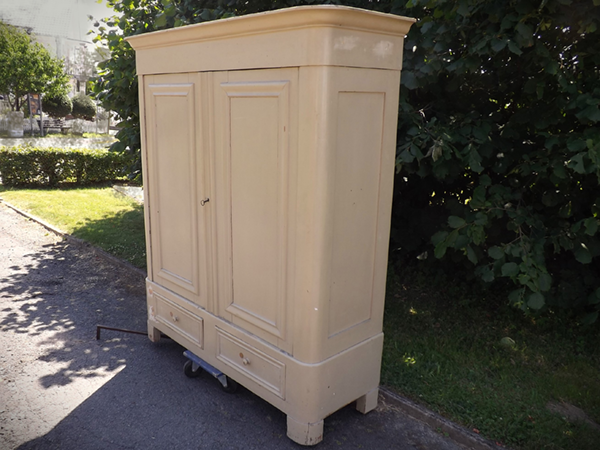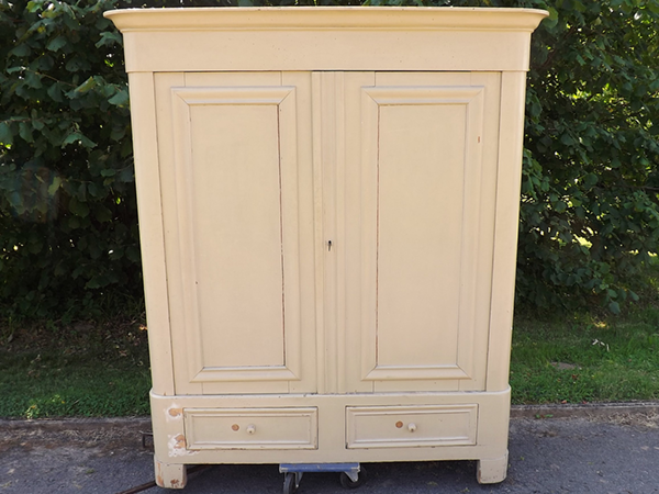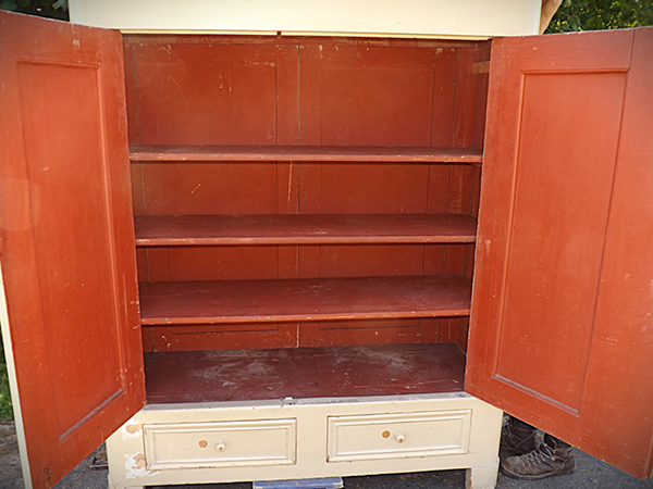 um 1860, Weichholz altweiß überstrichen. Zweitüriger, zerlegbarer Korpus auf Klotzfüssen; zwei Schubladen im Sockel. Hochrechteckige, profilgerahmte Füllungsfelder in der Front; einfach gerahmte Seiten. Breite, an den Kanten gerundete Lisenen; Karniesgesims. Im rot gefaßten Innern drei schrankbreite Fachböden. Ökologisch nachhaltiger & regionaler Speicherfund aus dem Bergischen Land. Unrestaurierter, alterskonformer Fundzustand.