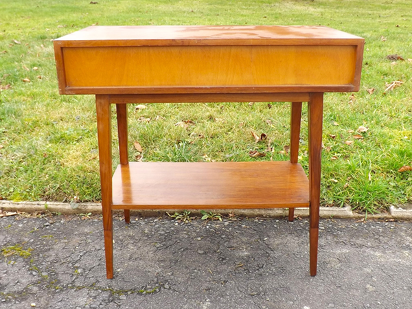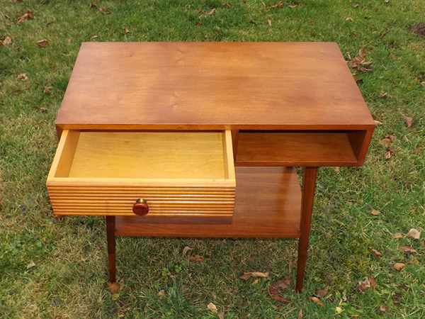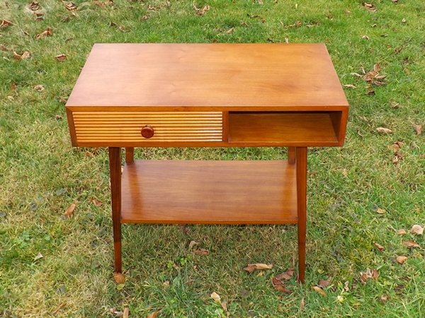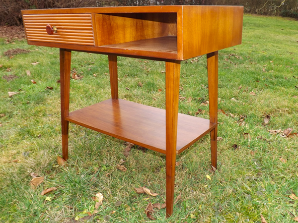1955er Jahre (Mid-Century). Westdeutsches Beistellmöbel im innovativen Design der Aufbruchzeit. Rechteckiger Zargenkasten auf vier konischen Spitzbeinen, linksseitig ein auf der Front horizontal gerillter Schub, rechts ein Freifach. Ablagebrett im Fußbereich. Wohnfertig restauriert.