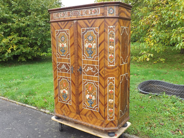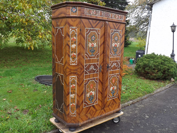 datiert 1790. Unzerlegbarer Weichholzkorpus auf Kugelfüßen; zwei, von sehr breiten Lisenen flankierte Türen. Auf ockerfarben maseriertem Grund polychrome Blumenmotive in hell gerahmten Feldern; Seitenwände einfach gehalten. Das offene, funktionsfähige Schloss mit Schlüssel und die geschmiedeten Bänder original.