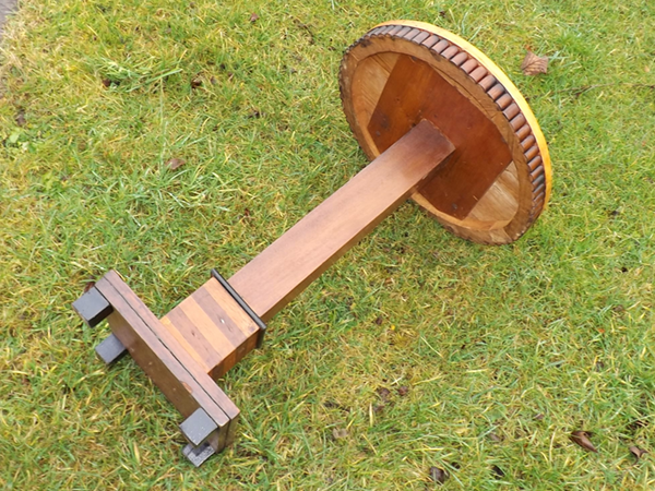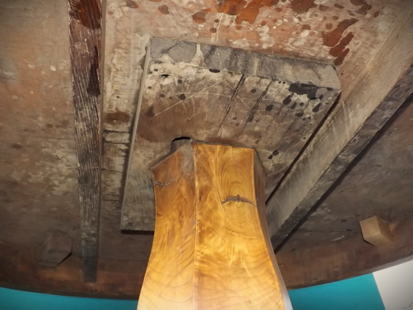 nachhaltiges Vollholz (Fichte/Tanne massiv). Durchgehende Holzplatte auf eingezapften, quer verstärkten Brettfüßen, seitlich verblendet (siehe Detailbild). Alterskonform gut erhaltener Patinazustand.