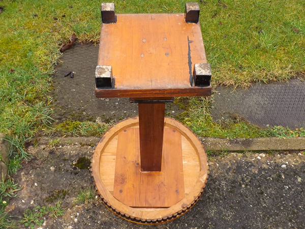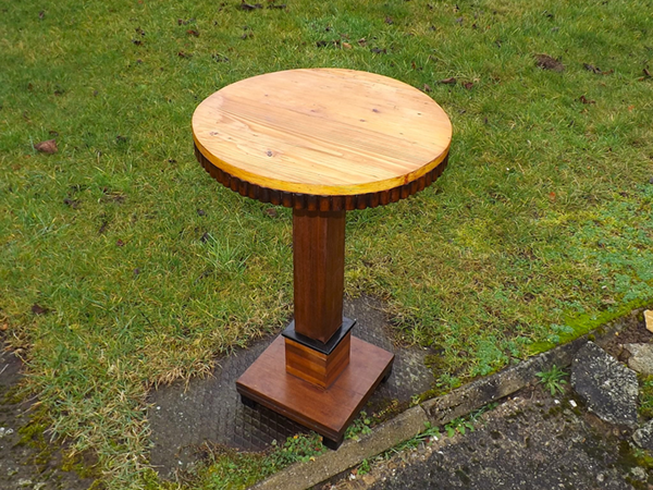 1920er Jahre. Schmale Zarge mit heller, runder Platte auf Vierkantschaft. Rechteckige Sockelplatte wechselnd, mit hell & dunkel horizontal furnierter Basis, auf Klotzfüßen. Wohnfertig aufbereitet, einige alterskonforme Alters- und Gebrauchsspuren.