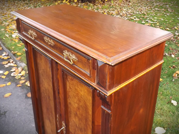 1920er Jahre; dreitürig, dreischübig. Flachrechteckiger Korpus auf hohen, gedrechselten Füßen, rechteckige Füllungsfelder in Front und Seiten, Linoleumplatte. Stark restaurierungsbedürftiger Fundzustand aus Bonner Nachlass.