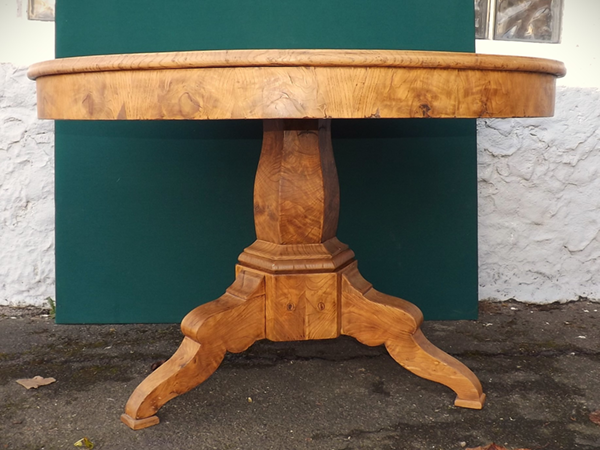um 1840. Unrestaurierter Fundzustand. Massive, an der Kante profilierte Platte, schmale aufrecht furnierte Zarge. Zentraler, hexagonaler Baluster, auf dreipassigem Sockel mit drei volutierten Beinen. Norddeutsches Biedermeiermöbel erste Hälfte 19. Jahrhundert. Alterskonforme Patina - siehe Detailbilder.