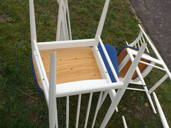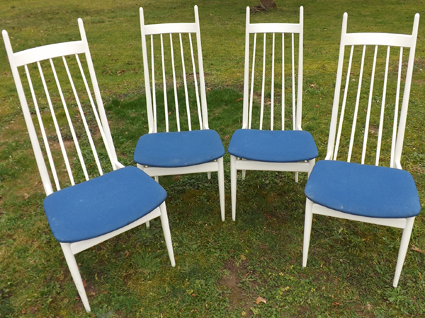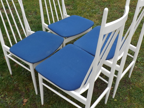 1960/70. Aus Bonner Nachlaß: vier hochlehnige Eßzimmer Sprossenstühle im skandinavischen Design. Weiße Gestelle aus Rundstäben, Lehnen vertikal versproßt. Aufgeschraubte blaue Flachpolstersitze, dadurch einfach wechselbare Sitzbezüge. Alterskonformer Fundzustand, Patina- und Gebrauchsspuren.