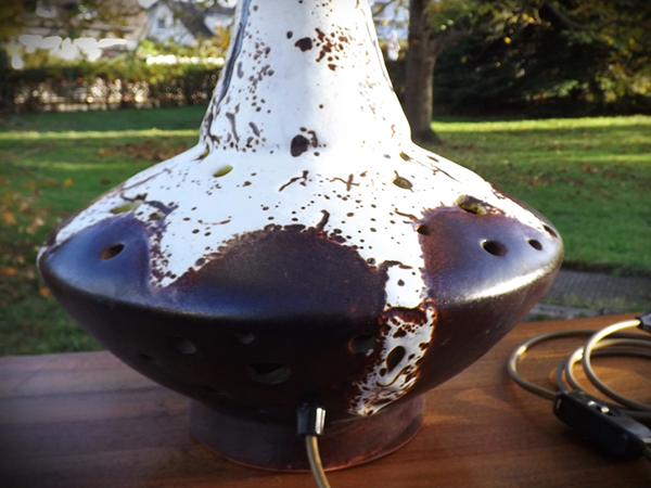 1980er Jahre. Fuß mit lavaartigem Glasurverlauf; funktionsfähige Elektrik; original erhaltener, textilbespannter, zylindrischer Lampenschirm. Klassisches Design westdeutscher Kunstkeramik der zweiten Hälfte des 20. Jh. Alterskonformer Erhaltungszustand, auch mit zeitgemäßen LED Leuchtmitteln nutzbar.