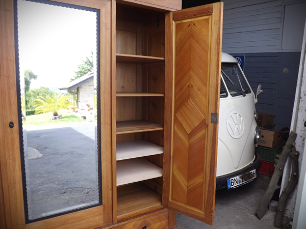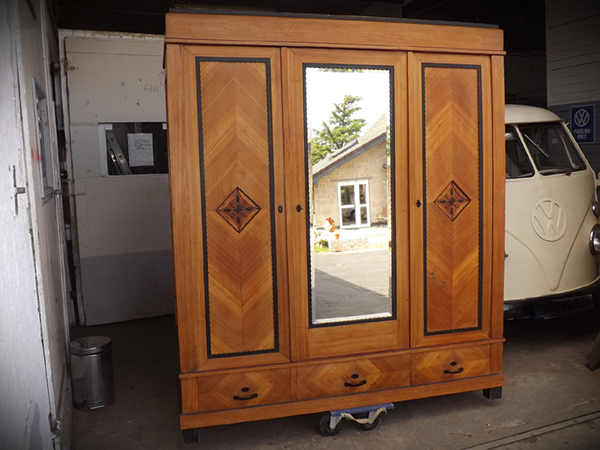 Dreitüriger Weichholzschrank im Design des frühen 20. Jahrhunderts. Einfach zerlegbarer Korpus auf Klotzfüßen. Im Sockel drei Schubladen; in der mittleren Tür ein großer Facettenschliff Spiegel; hochrechteckige, ebonisiert gerahmte Füllungsfelder mit zentraler Ornamentik in den flankierenden Türen. Innenaufteilung: links großzügige Tiefe für Kleiderbügel, darüber ein Ablagefach; rechts Fachböden. Ökologisch nachhaltig, da seit Generationen genutzt. Schlösser, Türschlüssel und Beschläge funktionsfähig. Wohnfertig aufgefrischter Patinazustand.