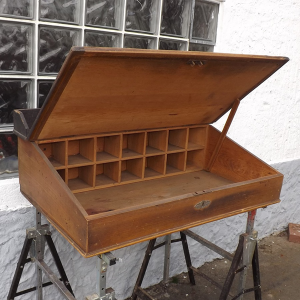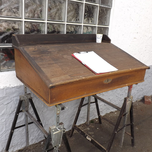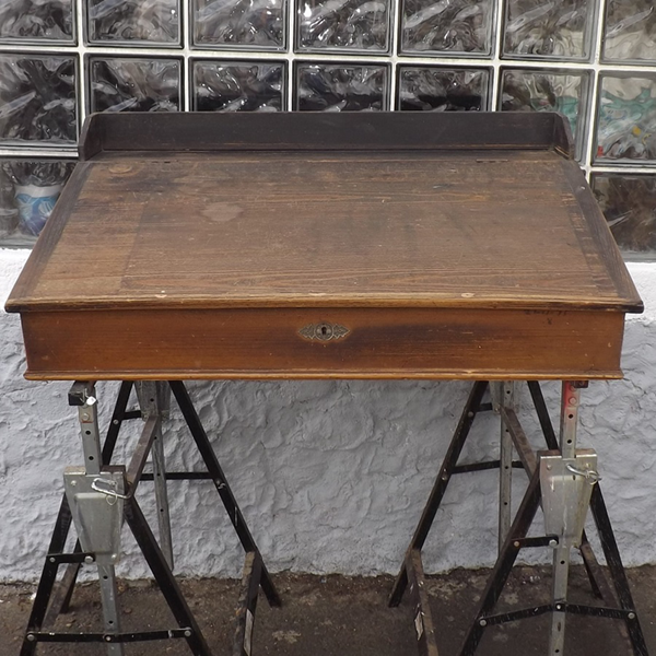 um 1900. Bierlasierter Korpus, schräg aufliegende, nach oben zu öffnende Klappe. Facheinteilung im Innern. Schloß und Beschlag original, Schlüssel abgängig. Ökologisch nachhaltiges Schreibmöbel aus dem Rheinland (Königswinter). Alterskonform guter, sofort nutzbarer Patinazustand.