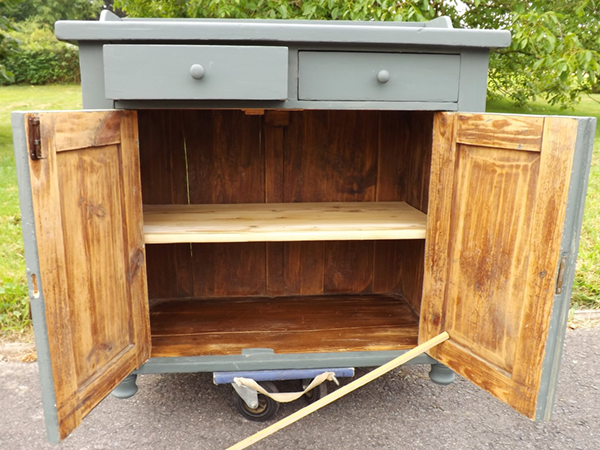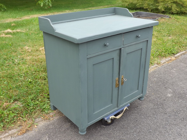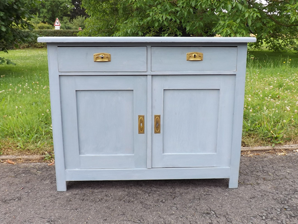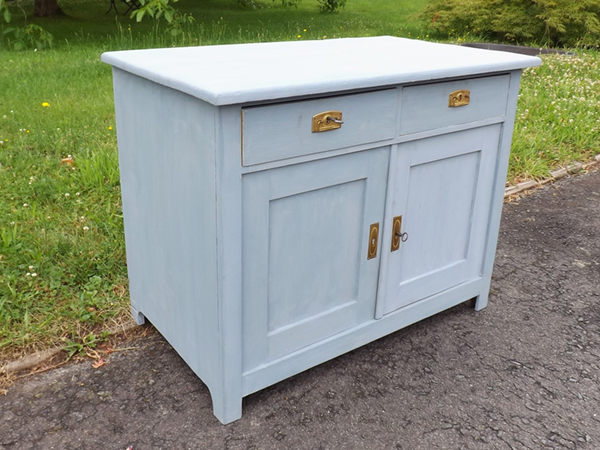 um 1920. Zwei Türen, darüber, zwei leichtgängige Schubladen; im unbehandelten Innern ein herausnehmbarer Fachboden. Flächige Seitenwände; leicht überkragende Platte. Neu gestaltete Oberfläche: seidenmatter Wachs auf taubenblauem Kreidegrund. Überholte, funktionsfähige Schlösser, Messingbeschläge.