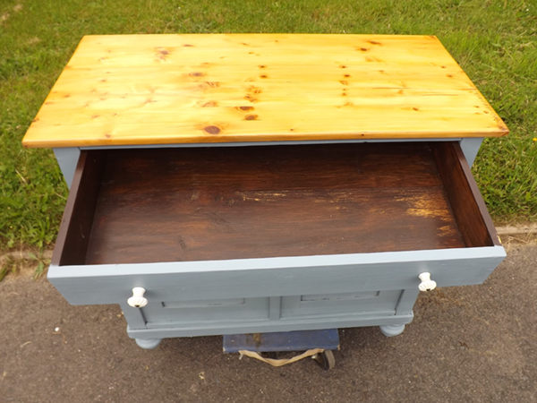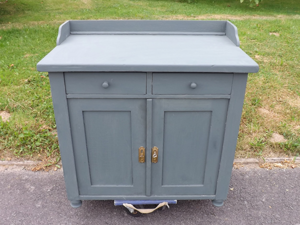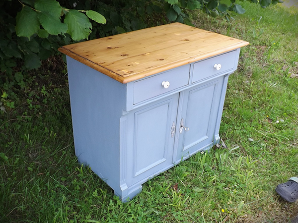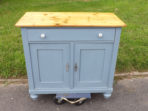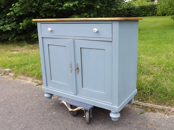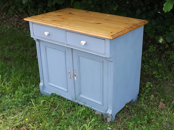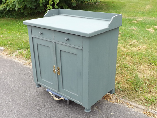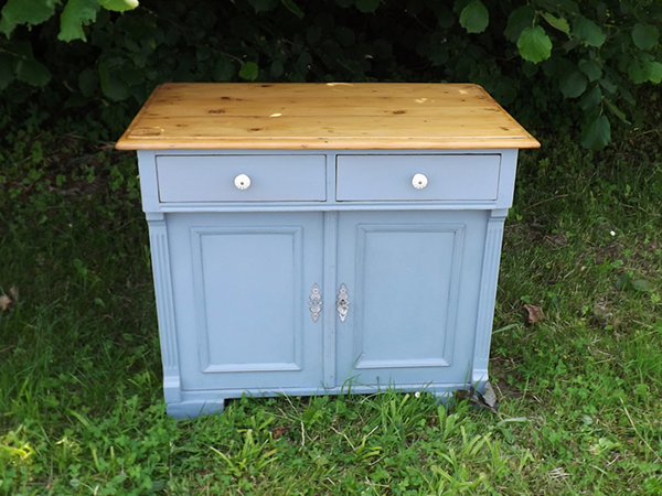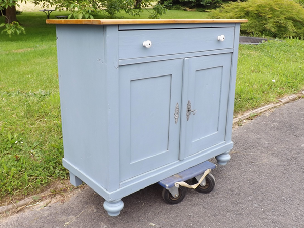 um 1920. Schmales, flaches Vintagemöbel aus Massivholz. Originaler Korpus auf Kugelfüßen; zweitürig mit darüber liegendem Schub. Flächige Seiten; leicht überkragende Platte. Neue Oberfläche: seidenmatte Wachspolitur auf taubenblauem Kreidegrund; wasserabweisend geölte Platte aus Tanne im Naturton. Im Innern ein Fachboden.