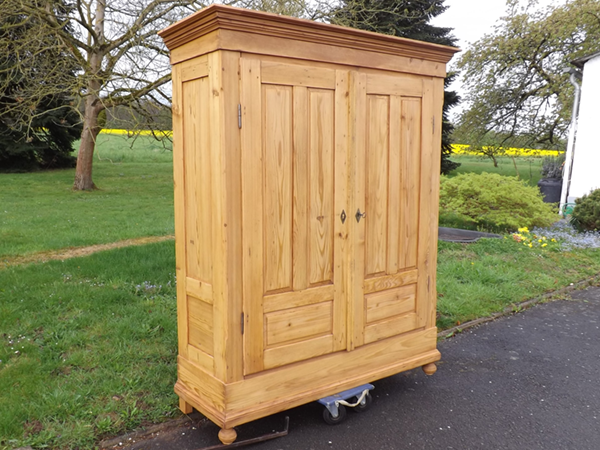 Durch Holzkeile einfach zerlegbarer, massiver Korpus auf Kugelfüßen. Zwei, außen angehangene Türen; vertikal & horizontal geteilte, erhabene Füllungsfelder auf der Front; einfach gefelderte Seitenwände. Breite, mehrfach profilierte Gesimsleiste. Originales, funktionsfähig aufbereitetes Kastenschloss mit passendem Schlüssel. Innenaufteilung nach Wusch. Sorgfältig, nachhaltig aufbereitet; Wachspolitur auf Schellackgrund - siehe Detailbilder.