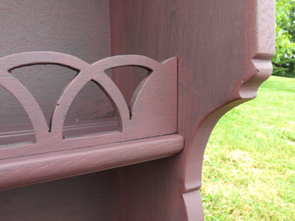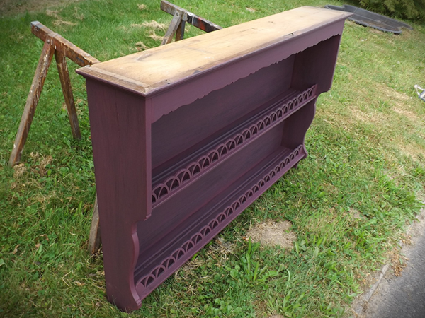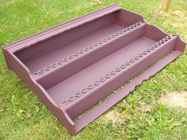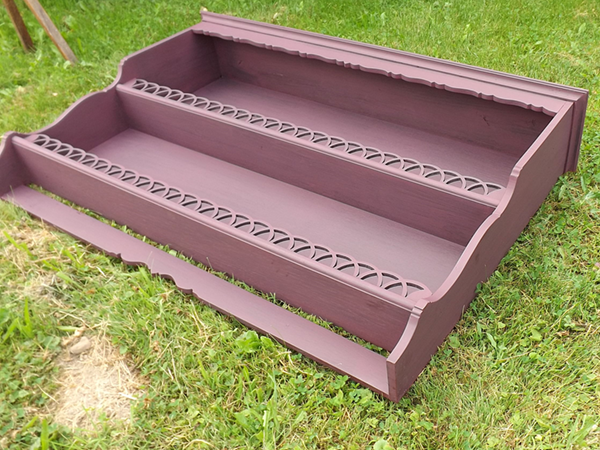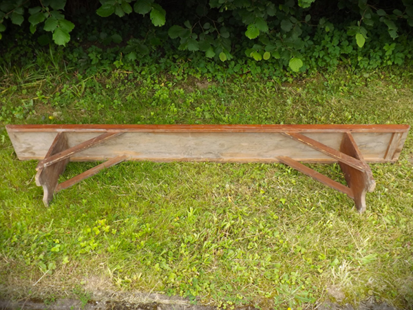 bereitetes Wandregal, aus massivem Eichenholz. Schmale, gekehlte Gesimsleiste; geschweifte, sich nach unten verjüngende Seiten. Im Innern zwei gerillte Fachböden, nach vorne durch Galerie begrenzt. Matte, unter Erhalt der Patina frisch gestaltete Oberfläche.