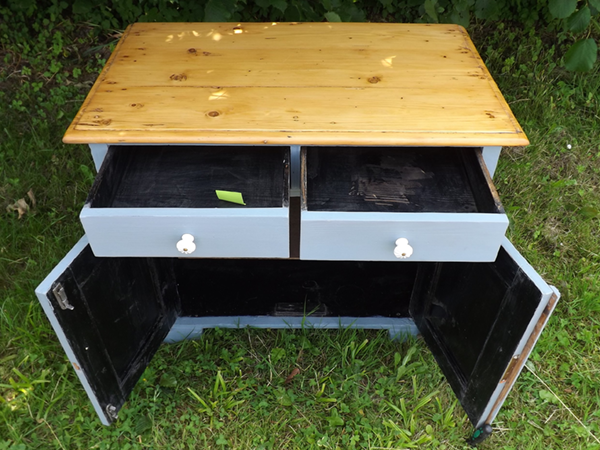 um 1910. Taubenblauer Vollholz Korpus; geölte Platte im Naturton. Zwei Türen, darüber vorgebaut, zwei Schubladen; im schwarz gefaßten Innern ein herausnehmbarer Fachboden. Flächige Seitenwände; leicht überkragende, profilierte Platte. Die Front verziert mit Kanneluren, Profilleisten und Voluten.