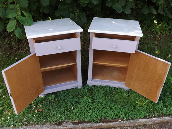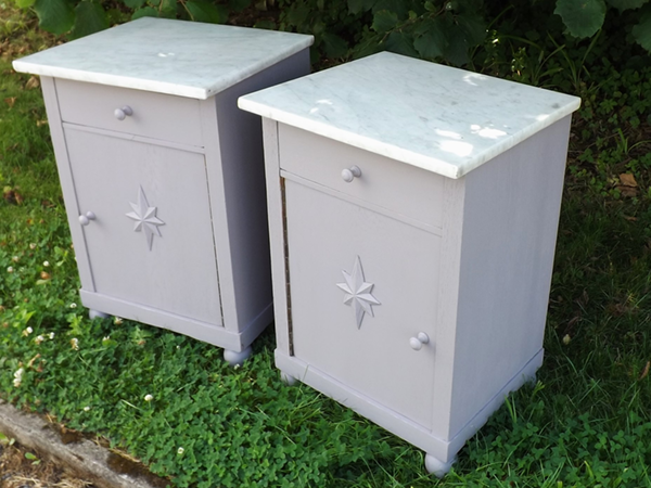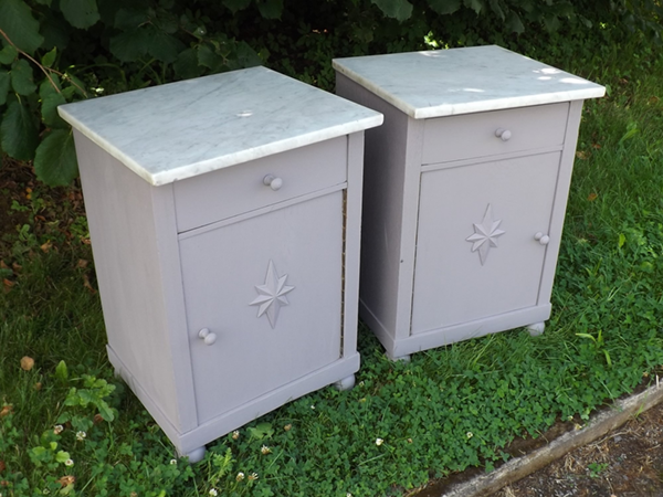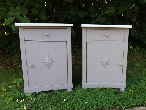 1930er Jahre. Beistellschränkchen mit jeweils einer Schublade und einer Tür, diese gegenläufig angeschlagen. In den Fronten aufgesetzte Sterne; flächige Seiten. Abnehmbare Deckplatten aus hellem Marmor. Ökologisch nachhaltige Kleinmöbel aus dem Rheinland (Bonn-Beuel), erste Hälfte zwanzigstes Jahrhundert.