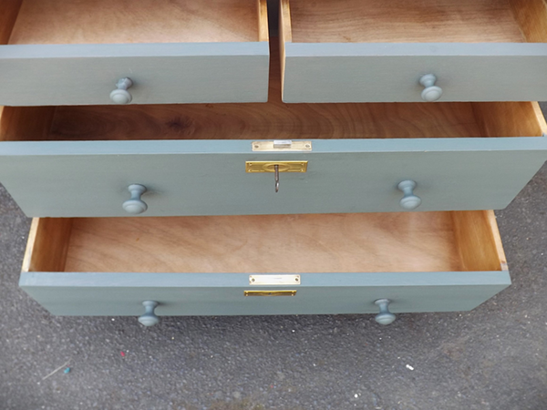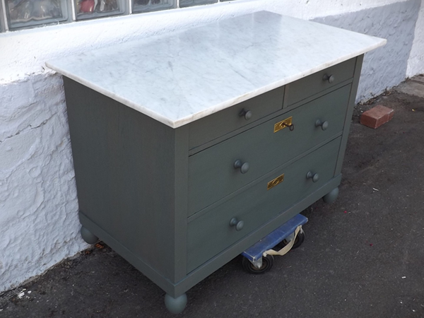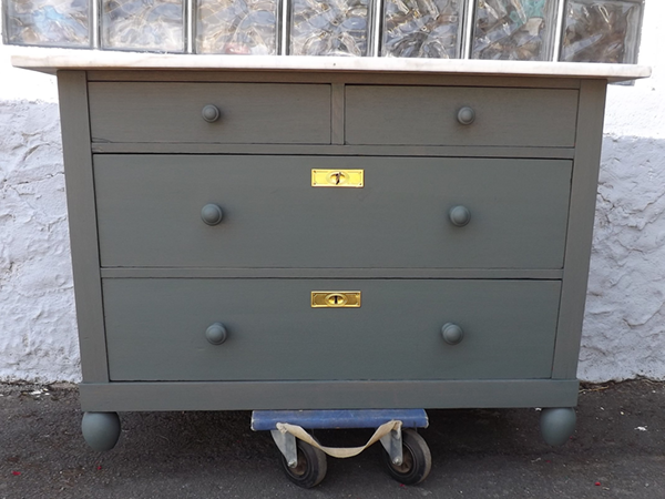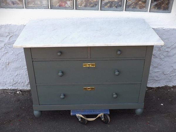 kreidefarben (Farrow&Ball „Green Smoke“). Sorgfältig restauriert: innen sauber & Schellack grundiert, außen angeschliffen, grundiert & gestrichen. Zwei kleine Schubladen nebeneinander, darunter zwei große übereinander; helle, abnehmbare Marmorplatte. Gängige Schübe, überholte, funktionsfähige Schlösser, mit einem originalen, gleichschließenden Schlüssel; Messingbeschläge.