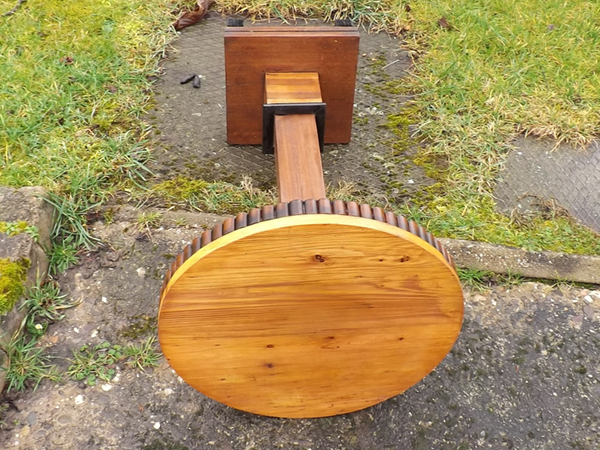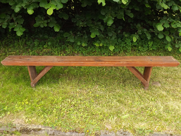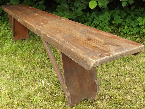 nachhaltiges Vollholz (Fichte/Tanne massiv). Durchgehende Holzplatte auf eingezapften, quer verstärkten Brettfüßen, seitlich verblendet (siehe Detailbild). Alterskonform gut erhaltener Patinazustand.