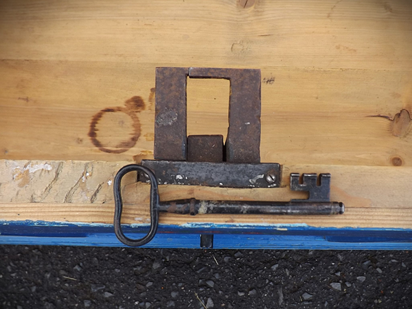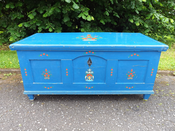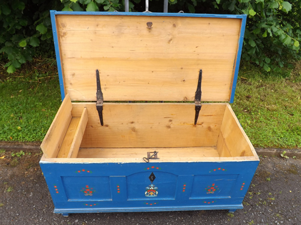 blau gefaßt. Gut & wohnfertig. Flachrechteckiger, sekundär überstrichener Korpus auf Spitzfüßen; frontseitig original datiert: 1836 und monogrammiert: „KR“ (unter der Zweitfassung schemenhaft sichtbar. Deckel zweifach, Front dreifach gefeldert. Geschmiedetes Zangenschloss, Schlüssel und Schlüsselschild original & funktionsfähig. Gefertigt in der südlichen Pfalz, frühes 19. Jahrhundert. Farbgebung sekundär; alterskonform guter, Erhaltungszustand.