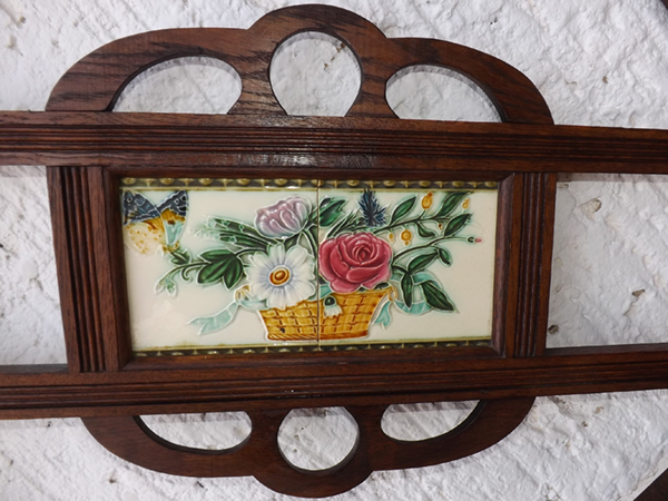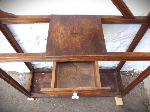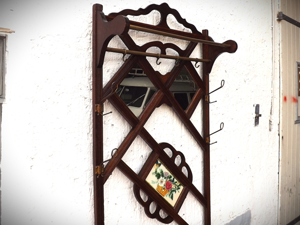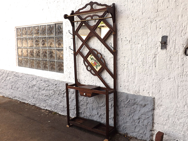um 1920. Flurgarderobe Eichenholz massiv. Flaches, asymmetrisch gestaltetes Gestell: unten ein vorspringender Schirmständer mit Metallwannen, darüber Ablage und Schubkasten. Oben zwei Spiegel umrahmt von Kleiderhaken und Messingstangen; mittig glasierte & reliefierte Fliesen mit Blumendekor. Alterskonform gut erhaltener, leicht aufgefrischter Fundzustand, sofort nutzbar.