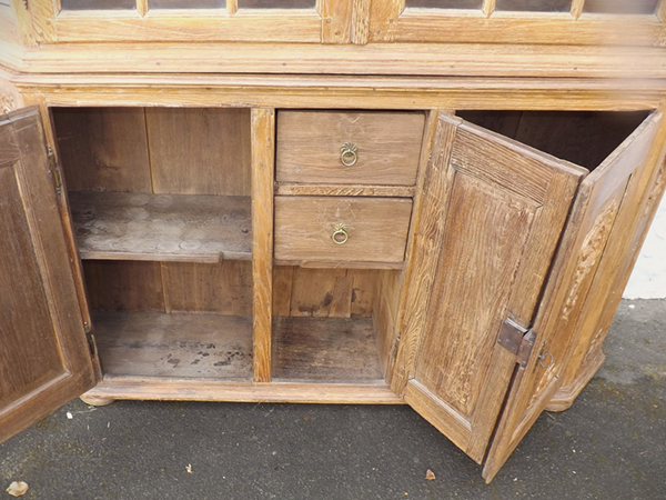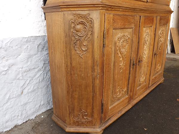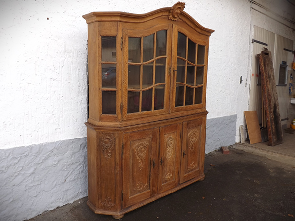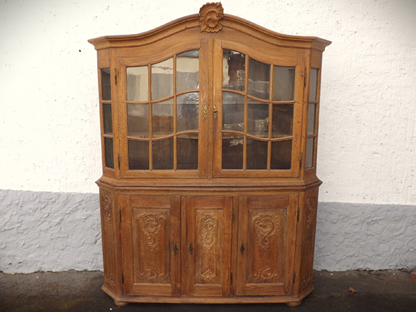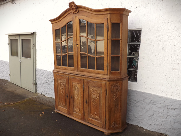 Eiche massiv (sog. "Prahlhans"). Flacher, an den Längskanten breit geschrägter Korpus mit außen angeschlagenen Türen. Vitrine: jeweils 9 durch Kreuzsprossen unterteilte Scheibenfelder in den beiden Türen und jeweils 3 in den Ecklisenen. Überkragendes, gebogtes Gesims mit geschnitzter Mittelkartusche. Unterschrank: mit Rocaillen beschnitzte Füllungsfelder auf den drei Türen und den geschrägten Längskanten. Hinter der schmaleren, mittigen Tür zwei Schübe. Wohnfertig: ältere, gut erhaltene Restaurierung.