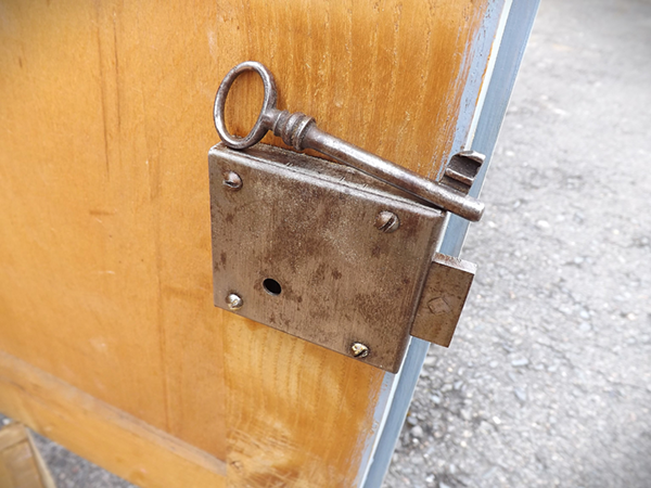 Einfach zerlegbarer, massiver Korpus (4 Holzkeile) auf Kugelfüßen. Zwei, außen angehangene Türen; vertikal & horizontal geteilte, erhabene Füllungsfelder auf der Front; einfach gefelderte Seitenwände. Breite, mehrfach profilierte Gesimsleiste. Originales, funktionsfähig aufbereitetes Kastenschloss mit passendem Schlüssel. Innenaufteilung nach Wusch. Sorgfältig, nachhaltig aufbereitet; Wachspolitur auf Schellackgrund.