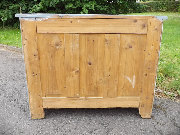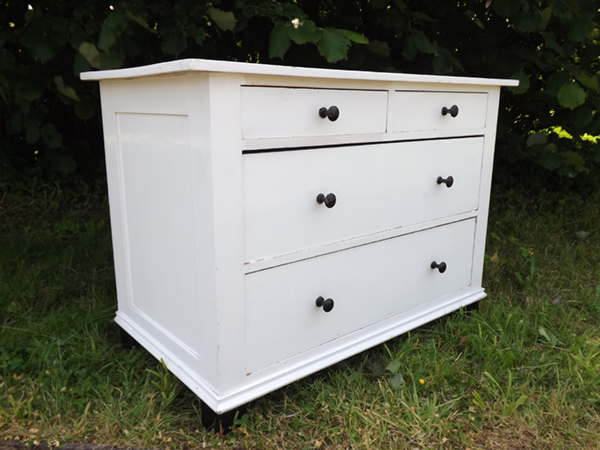Korpus, massiv Weichholz mit Sperrholzfüllungen. Zwei kleine Schübe nebeneinander, darunter zwei große übereinander liegend. Gefelderte Seitenwände; sekundäre, überkragende Deckplatte. Ökologisch nachhaltiges Antikmöbel aus dem Rheinland, erste Hälfte zwanzigstes Jahrhundert.