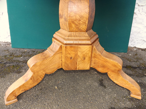 um 1840. Unrestaurierter Fundzustand. Massive, an der Kante profilierte Platte, schmale aufrecht furnierte Zarge. Zentraler, hexagonaler Baluster, auf dreipassigem Sockel mit drei volutierten Beinen. Norddeutsches Biedermeiermöbel erste Hälfte 19. Jahrhundert. Alterskonforme Patina - siehe Detailbilder.