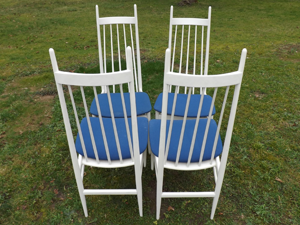 1960/70. Aus Bonner Nachlaß: vier hochlehnige Eßzimmer Sprossenstühle im skandinavischen Design. Weiße Gestelle aus Rundstäben, Lehnen vertikal versproßt. Aufgeschraubte blaue Flachpolstersitze, dadurch einfach wechselbare Sitzbezüge. Alterskonformer Fundzustand, Patina- und Gebrauchsspuren.