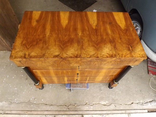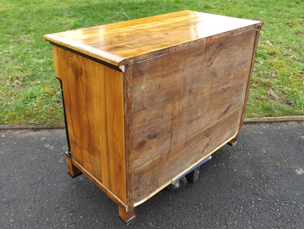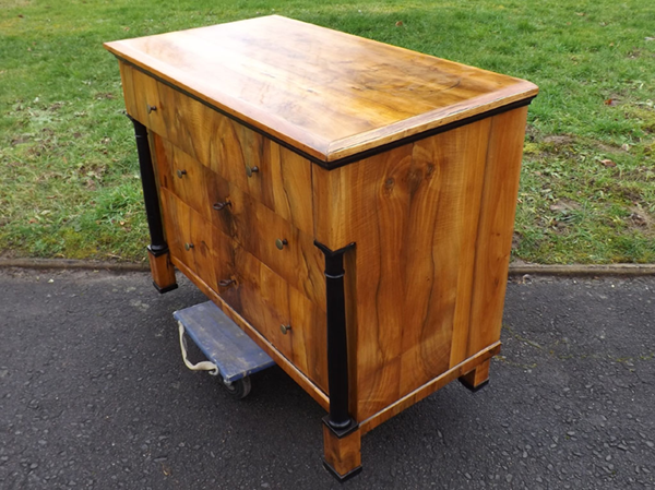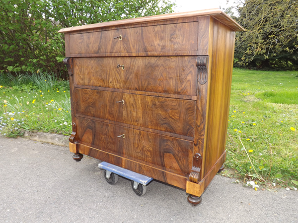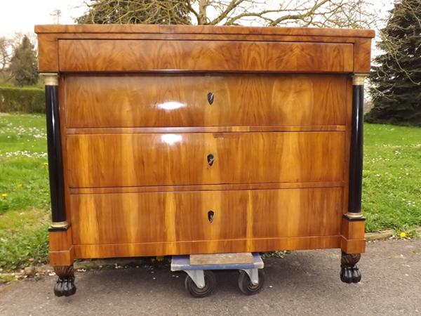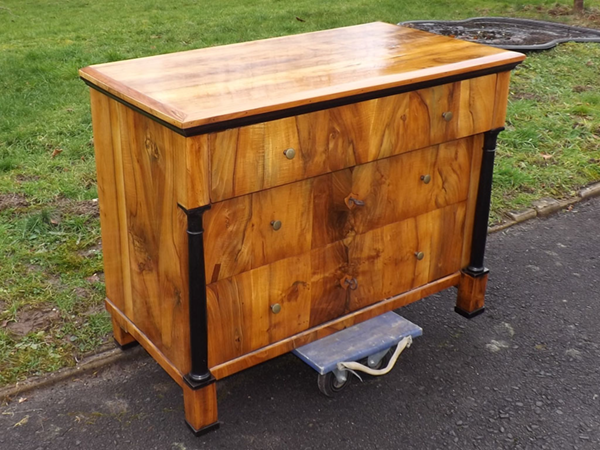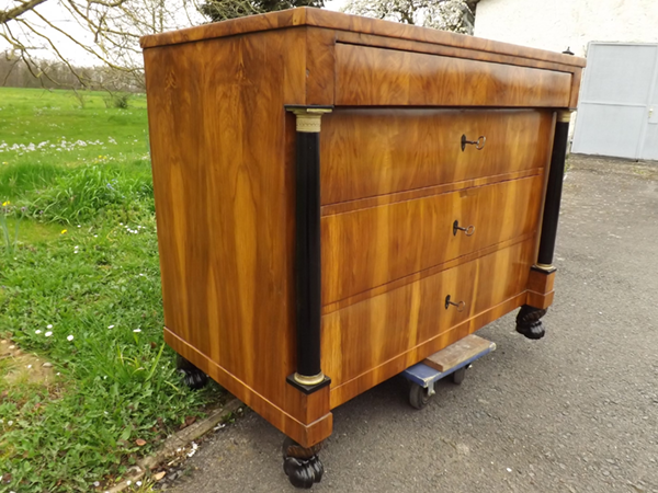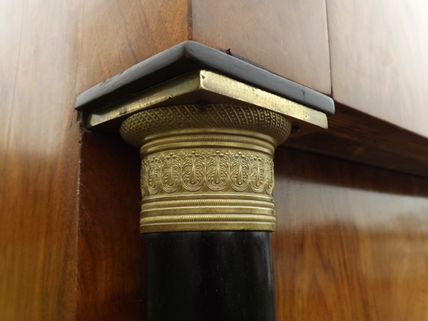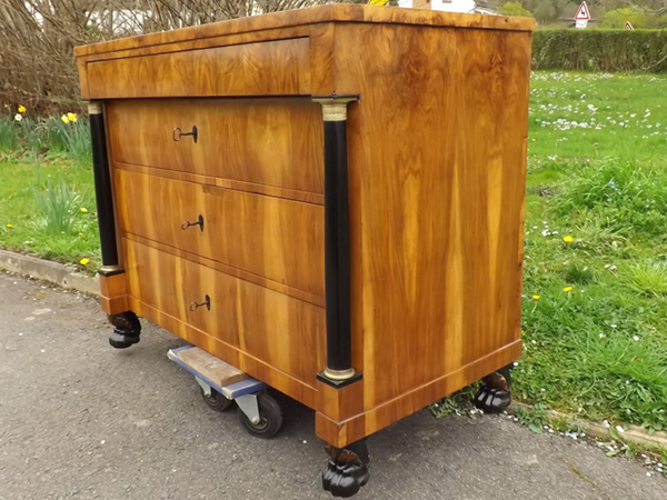 furniert (Rheinland, um 1810). Korpus auf vier ebonisierten Tatzenfüßen; der oberer Schub und die Sockelleiste vorgebaut. Die drei unteren Schubladen flankiert von ebonisierten Säulen mit Basen und Kapitellen aus ziseliertem Messing (siehe Detailbilder). Wohnfertiges Originalmöbel des Klassizismus. Originale, instand gesetzte Schlösser, eingelegte Schlüsseleinfassungen; Schellackoberfläche.