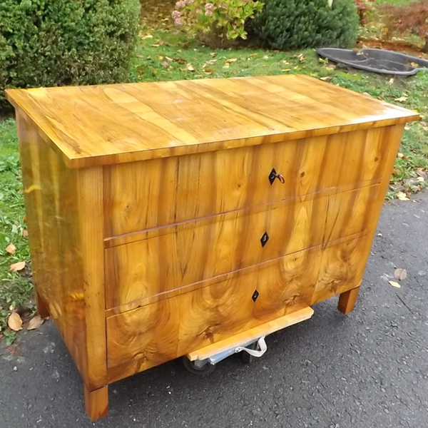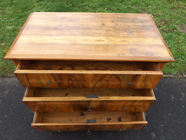 furniert. Oberer, schmaler Schub karniesförmig geschweift, darunter zwei gerade, von Kehlleisten gerahmte Schübe. Flächige Seitenwände, dicke, wenig überkrnagende Platte. Bürgerliches Möbel, entstanden um 1850; restaurierter Zustand, frische Schellackoberfläche.