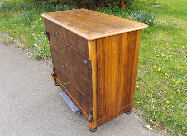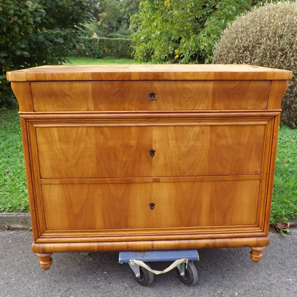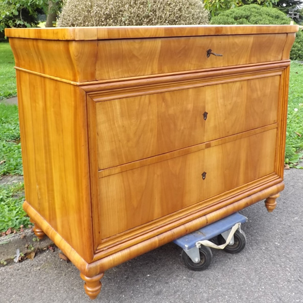 geölt; Gründerzeit um 1900. Vierschübiger Korpus auf Kugelfüßen; überkragende, profilierte Platte. Der obere Schub leicht vorgebaut; flächige Seitenwände; Lisenen verziert durch Schnecken. Wohnfertig aufbereitet: Hartöloberfläche außen, Schellackgrundierung im Innern, funktionsfähige Schlösser.