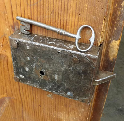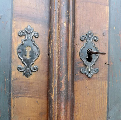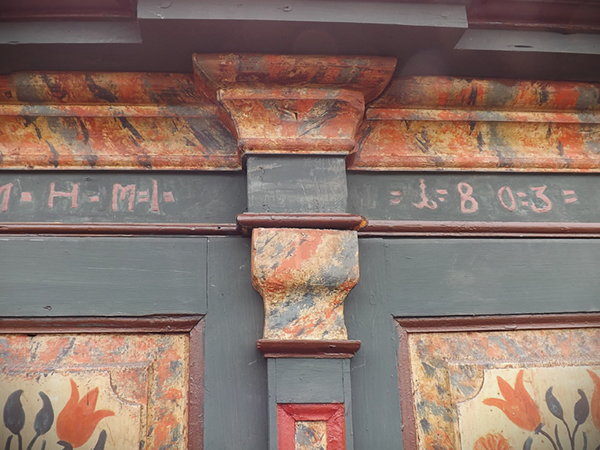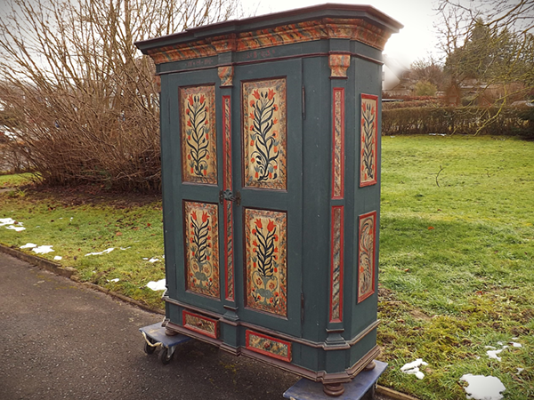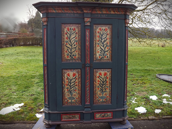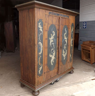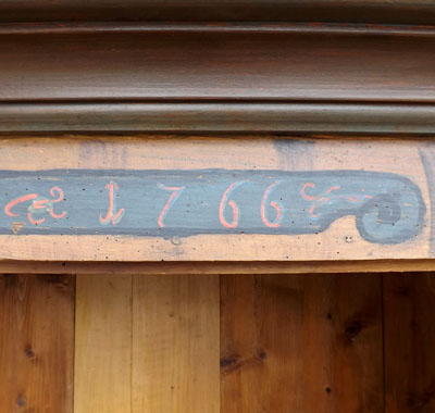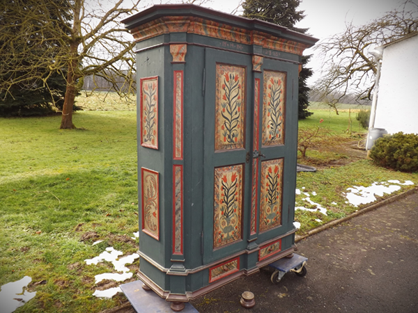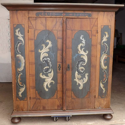 (Bauernkasten Rokoko). Mittig teilbarer Weichholzkorpus; allseitig flächig. Zwei, von sehr breiten Lisenen flankierte Türen. Front: auf ockerfarbenen maseriertem Grund helle, polychrome Rocaillen in blau gehaltenen Feldern. Seitenwände einfach bierlasiert. Im Türsturz zeitgenössisch monogrammiert und datiert: E.L.S.B 1766. Fassung, Schloss und Beschläge original, Kranzleiste und Sockel sekundär (siehe Detailbilder, auch zum Fundzustand). Klassisches Landhausmöbel aus dem südlichen Thüringen, Mitte 18. Jahrhundert.