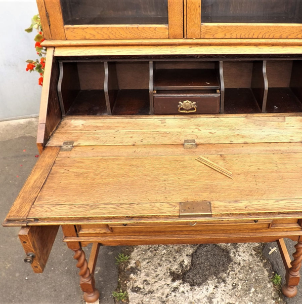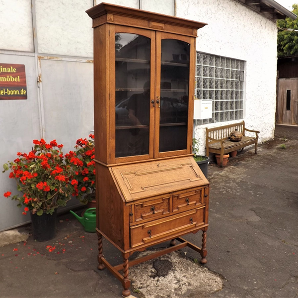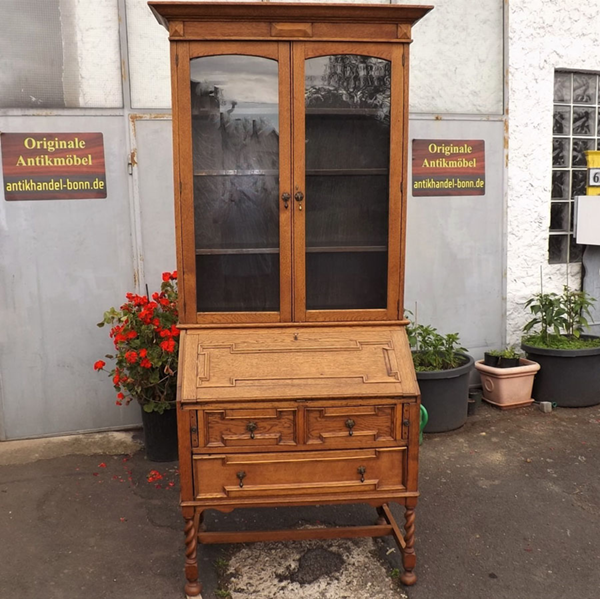 Eiche mittelbraun. Zweiteiliger, englischer Schreibsekretär, um 1910/20. Unterteil auf spiralförmigen, durch Fußbrücke verbunden Beinen. Durch Profilleisten verkröpft gerahmte Füllungen auf den Fronten der drei Schübe und der Schrägklappe; schlichtes Schreibfach mit zentraler Schublade. Hoher, zweitürig verglaster Aufsatz mit verstellbaren Fachböden im Innern; abnehmbare Gesimsleiste. Unrestaurierter, alterskonform guter, sofort nutzbarer Erhaltungszustand; alte Reparaturen und Gebrauchsspuren: siehe Detailbilder.