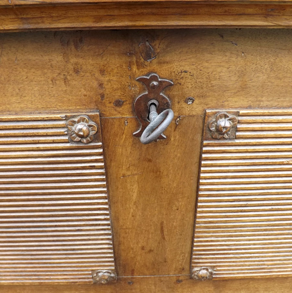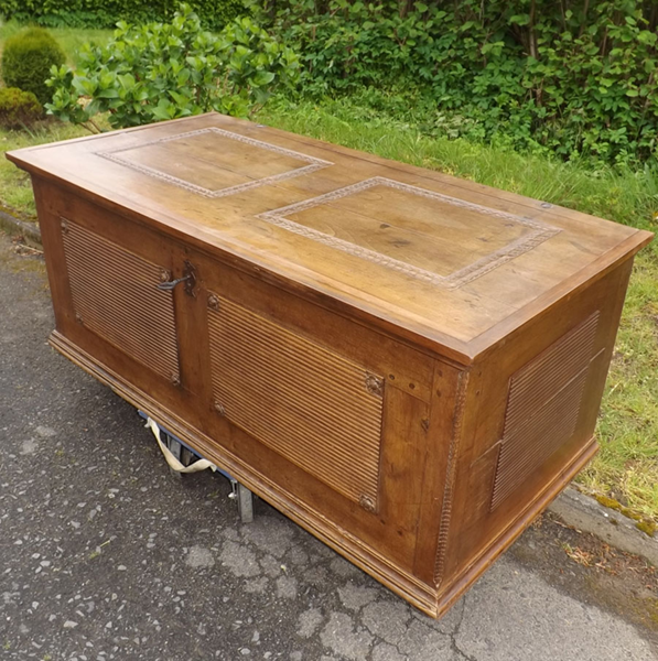 (Landhaustruhe Louis-Seize). Rechteckiger Korpus; flacher, an den Kanten zweifach gekehlter Deckel. Rillendekor auf Front und Seiten, gekerbt beschnitzte Felder auf der Klappe (siehe Detailbild). Schloss und Schlüsselschild original, alter Schlüssel. Gefertigt in der südlichen Eifel, spätes 18. Jahrhundert. Behutsam restauriert unter Erhalt der natürlich gewachsenen Patina (ungeschliffen) - seidenmatte Oberfläche.