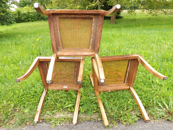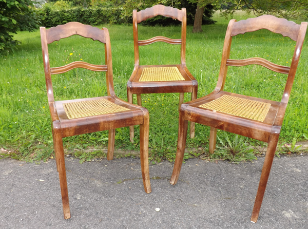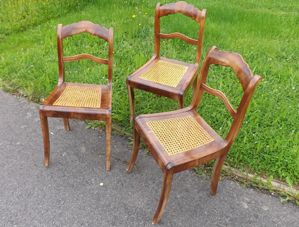 Mahagoni, Spätbiedermeier. Säbelbeine vorne und hinten; Rückenlehnen leicht nach hinten geneigt. Schulterbretter und Querriegel geschweift; Sitzflächen geflochten (Peddigrohr). Klassische Seitenrahmenstühle aus Hessen, Mitte neunzehntes Jahrhundert. Ältere, gut erhaltene Restaurierung, gebrauchsfähiger Zustand.