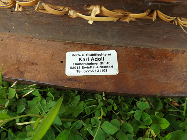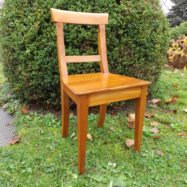 (ländlicher Brettstuhl). Leicht nach hinten geneigte Rückenlehne mit konkaver Schaufellehne. Spitzbeine, an den Seiten leicht gerundeter Brettsitz. Moselland, erste Hälfte 19. Jahrhundert. Ältere, nutzbare Restaurierung.