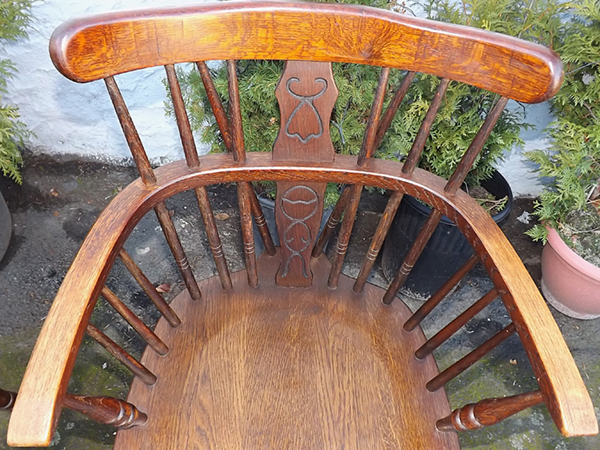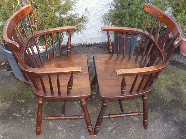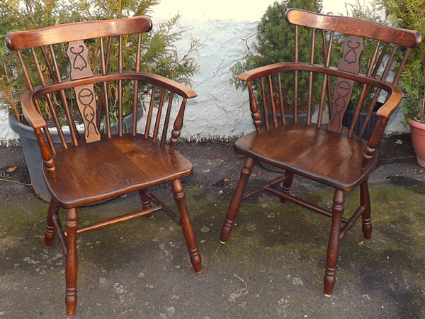 Eichenholz (Stick Back Windsor Armchairs), aus Bonner Nachlaß. Aus gedrechselten Rundstäben gefertigte Beine, ergonomisch geformte, starkwandige Sitze. Doppelstöckige, in die Armlehnen übergehende Rücken. Seidenmatte, aufgefrischte Oberflächen.