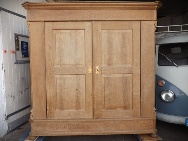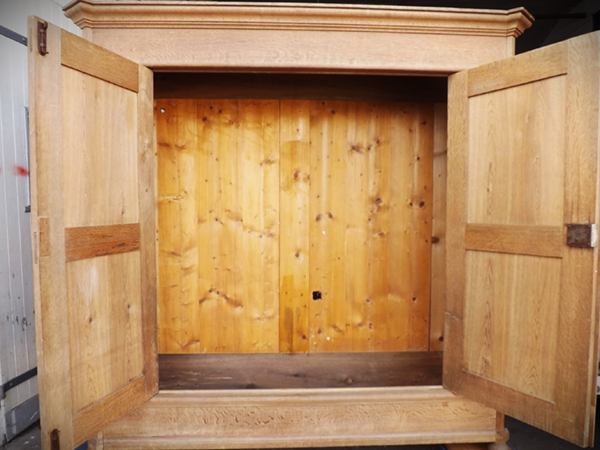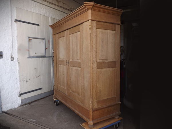 Nordeifel um 1870 (Kleiderschrank antik). Durch Holzkeile zerlegbarer, zweitüriger Korpus aus heller Eiche. Mittig geteilte, erhabene Füllungsfelder auf Front und Seiten; leicht geschrägte, mit Voluten verzierte Längskanten. Im Innern großzügige Tiefe für Kleiderbügel. Ökologisch nachhaltiges Vollholzmöbel, seit mehreren Generationen in Gebrauch - nun bereit für weitere Jahrhunderte bestimmungsgemäßer Nutzung.