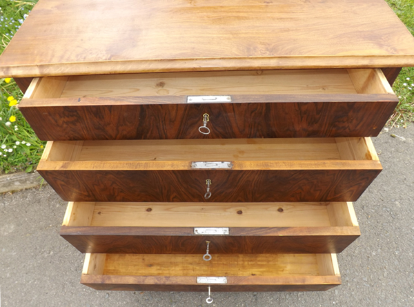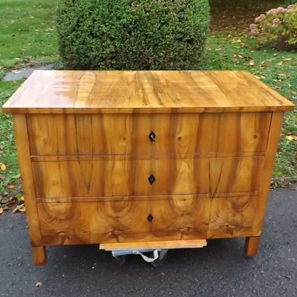 Nussbaum. Dreischübiger Korpus auf Stollenfüßen, Front, Seiten und Platte aufrecht auf Nadelholz furniert. Ebonisierte, eingelegte Schlüsseleinfassungen; drei gleichschließende Kastenschlösser, ein originaler Schlüssel. Bürgerliches Möbel aus Bonn, entstanden um 1820/30. Schellack polierte Oberfläche.