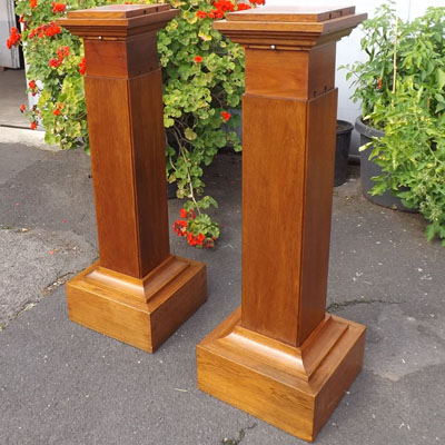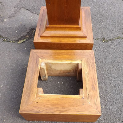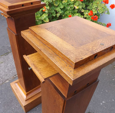 und Eiche auf Nadelholz furniert (Blumenständer antik). Die Vierkantschäfte von den quadratischen Sockeln abnehmbar, frontseitig kleine einschiebbare Ablagen. Teile einer Kapelleneinrichtung aus Bonn-Oberkassel (Herz-Jesu-Kloster). Entstanden im frühen 20. Jahrhundert. Seidenmatte Oberflächen.
