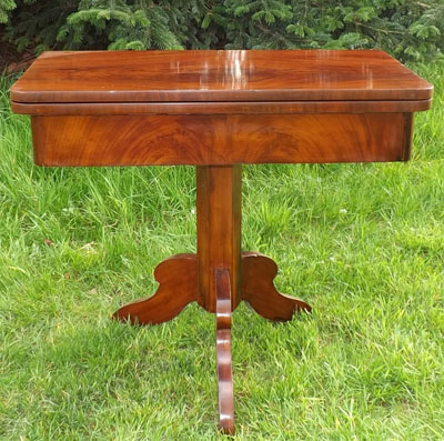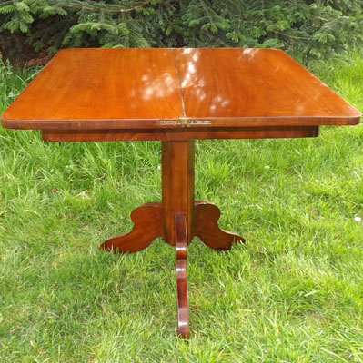 furniert (Beistell-Klapptisch). Zargenkasten auf hexagonalem Schaft mit drei volutierten Füssen. Die rechteckige Platte drehbar, im offenem Zustand quadratisch. Bürgerliches Salonmöbel aus Bonn (Bad-Godesberg), erste Hälfte 19. Jahrhundert. Schellack handpoliert.
