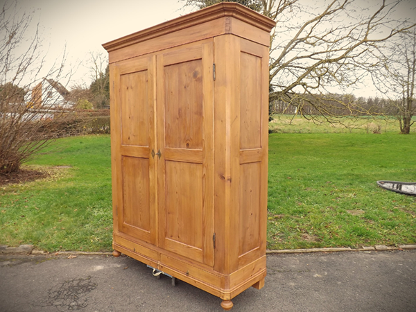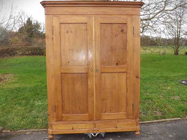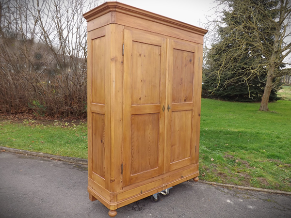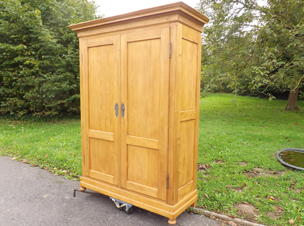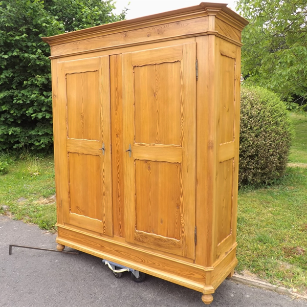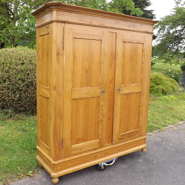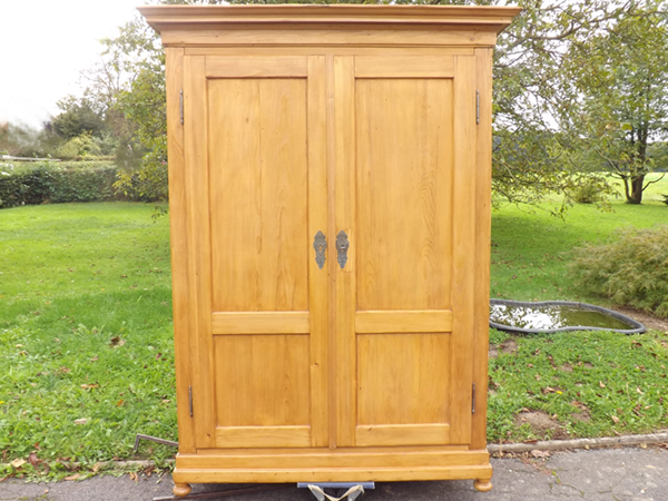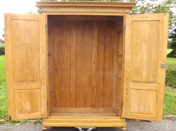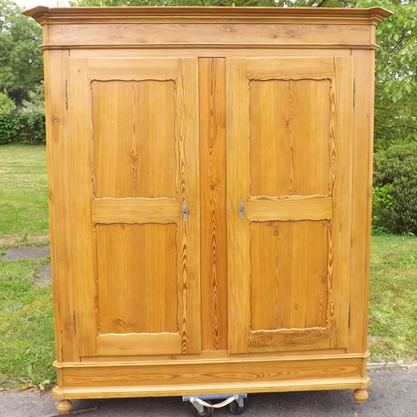Kiefer massiv, Pfalz um 1860. Durch Holzverkeilung zerlegbarer Kleiderschrank; geschrägte Längskanten auf Kugelfüßen. Zwei außen, an Mittelsteg anschlagende Türen, geteilte Füllungsfelder in Front und Seiten (siehe Detailbilder). Mehrfach profiliertes, stark auskragendes Kranzgesims. Kastenschlösser und Schlüssel original, Beschläge sekundär. Ältere, aufgefrischte Restaurierung; helle, seidenmatte Oberfläche.
