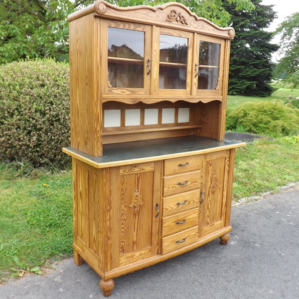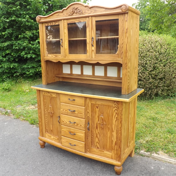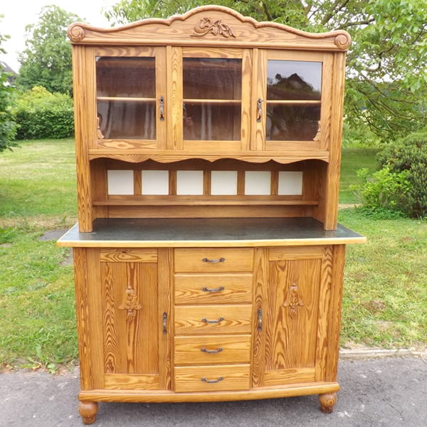 1920er Jahre (Küchenschrank Kiefer massiv). Zweiteiliger Korpus auf gedrehten Füssen. Unterschrank: mittig fünf übereinanderliegende Schubladen, flankiert von zwei Türen; große, vorne konvexe Ablagefläche aus grünem Linoleum. Im Hintergrund sechs weiße Fliesen und ein schmales Regal. Aufsatz: dreitürig verglast; geschweifte Bekrönung; zwei herausnehmbare Fachböden im Innern siehe (siehe Detailbilder). Glas, Fliesen, Beschläge und Schlösser original. Nachhaltiges, regionales Generationenmöbel des frühen 20. Jahrhunderts, aus dem Raum Bonn. Wohnfertig: außen Wachs auf Schellackgrund, Platte wasserabweisend Hartöl behandelt, die Innenräume grundiert.