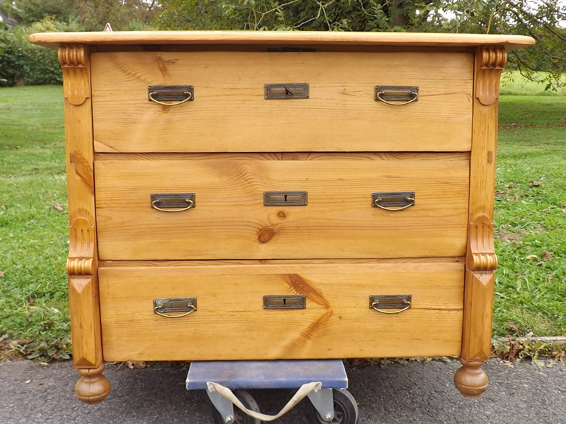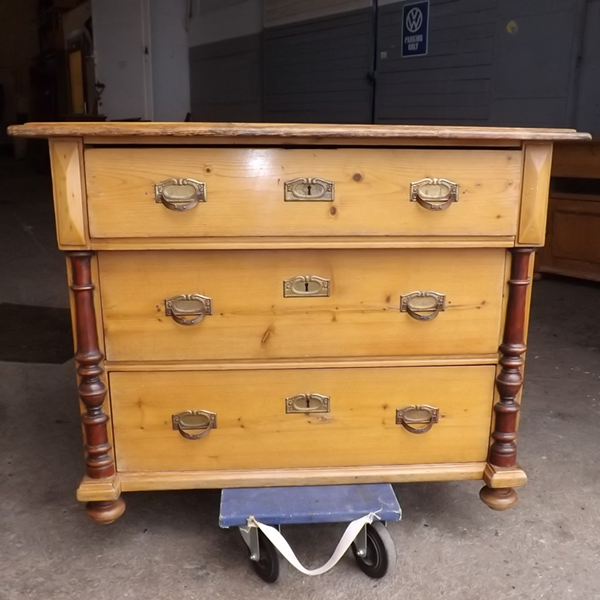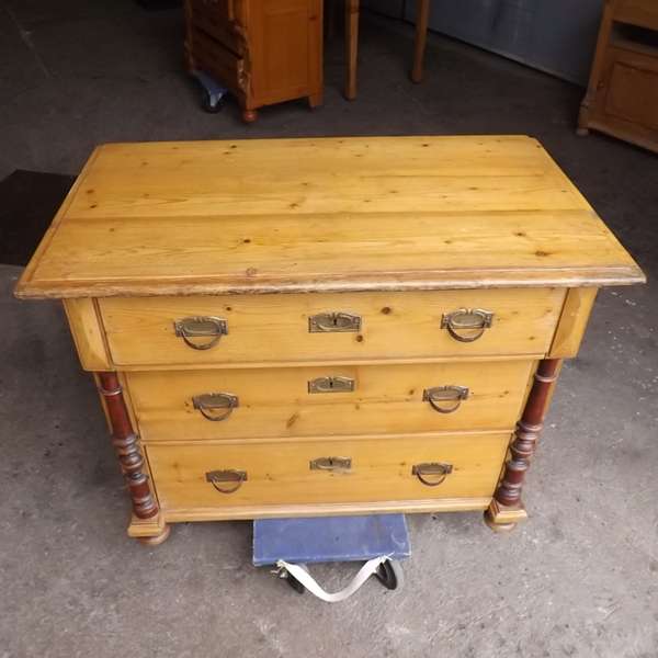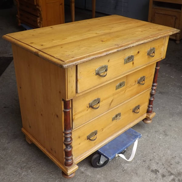 Weichholz, um 1900. Drei übereinander liegende Schubkästen, flächige Seitenwände; leicht überkragende, an den Kanten profilierte Platte. Lisenen verziert durch Prismen und gedrechselten Halbsäulen; Kugelfüsse (siehe Detailbilder). Seit Generationen genutztes, ökologisch nachhaltiges Vollholzmöbel. Ältere Restaurierung mit einigen Gebrauchsspuren.