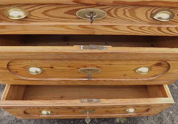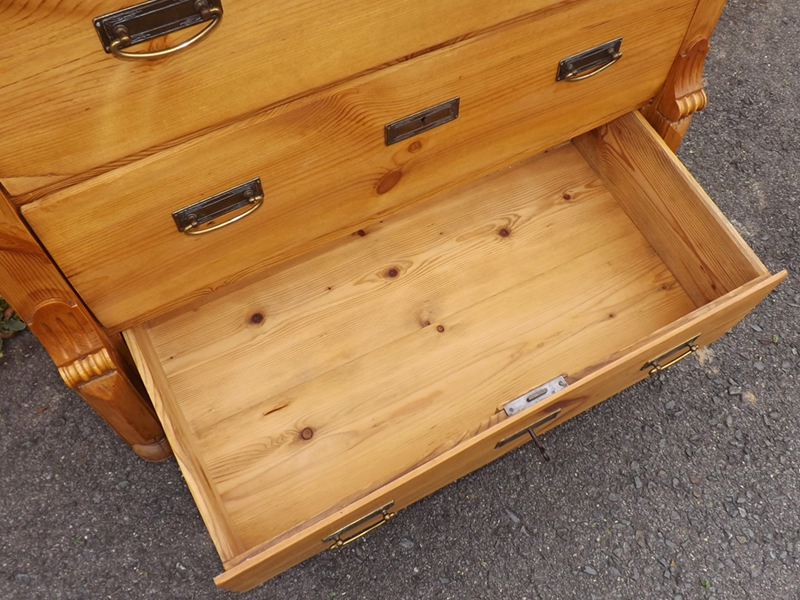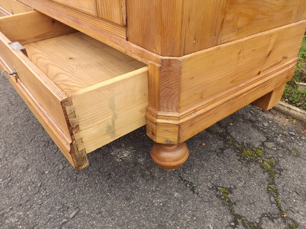 Weichholz hell gewachst. Dreischübiger Korpus auf Kugelfüssen; flächige Seitenwände; leicht überkragende, an den Kanten profilierte Platte. Lisenen verziert durch Prismen und Schnecken. Instand gesetzte, gängige Schubladen; funktionsfähige Schlösser und Beschläge. Seit Generationen genutztes, deutsches Antikmöbel aus Vollholz, wohnfertig restauriert; Wachspolitur auf Schellackgrund.