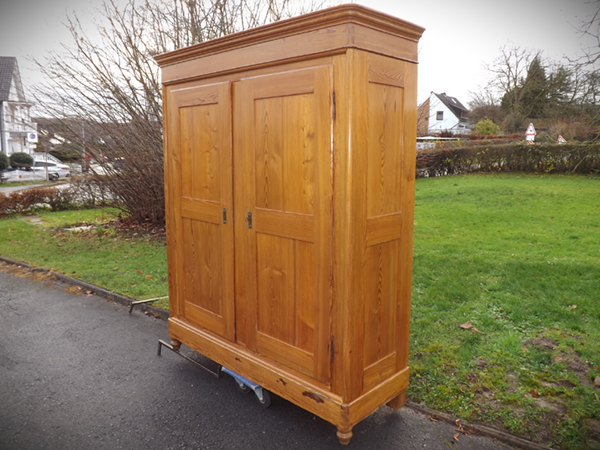 Köln um 1860. Wohnfertig restauriert. Kleider- oder Dielenschrank Massivholz (Fichte/Tanne). Hoher, holzverkeilter Korpus auf Kugelfüßen; stark überkragendes, profiliertes Gesims; schmale Lisenen. Zwei, außen angehangene Türen; geteilte Füllungsfelder in Front und Seiten. Innen großzügig Raum für Kleiderbügel; Hutablage und Kleiderstange im Preis inbegriffen, weitere Fachböden gegen Aufpreis möglich. Nachhaltig aufbereitet; Wachspolitur auf Schellackgrund.