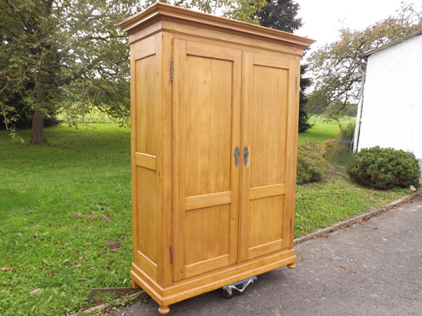 ländliches Biedermeier, Mitte 19. Jh. Einfach zerlegbarer Korpus (4 Holzkeile) auf Kugelfüßen. Zwei, außen angehangene, an Mittelsteg anschlagende Türen; geteilte Füllungsfelder in Front und Seiten. Breite, mehrfach gekehlte Gesimsleiste; gerundete Längskanten. Im Innern ausreichend Raum für Kleiderbügel; oben eine schrankbreite Hutablage. Funktionsfähiges Kastenschloss mit passendem Schlüssel. Ältere aufgefrischte Restaurierung, seidenmatte Oberfläche - siehe Detailbilder.